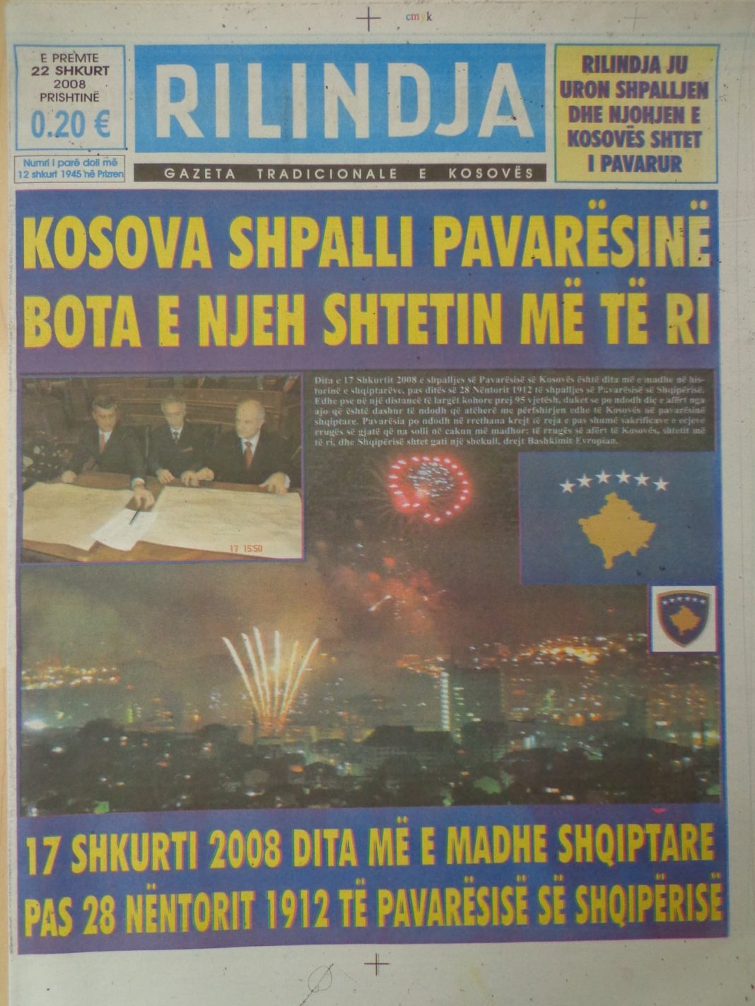 Po në ballinë, nën imazhet e nënshkrimit të Deklaratës së Pavarësisë së Kosovës, të Flamurit e Stemës së shtetit të ri evropian dhe fishekzjarreve të festimeve në Prishtinë, Rilindja shkruante poashtu me shkronja ngjyrë ari: 17 SHKURTI 2008 DITA MË E MADHE SHQIPTARE PAS 28 NËNTORIT 1912 TË PAVARËSISË SË SHQIPËRISË.