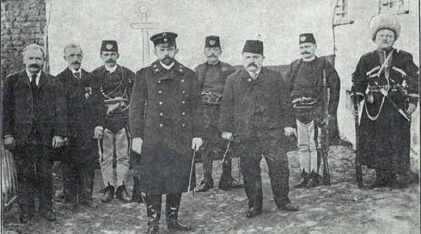 Në këtë foto mund ta vëreni konsullin e Rusisë Cariste, Shqerbinin, veshur me rroba ushtarake e në prapavij ishin “serbët” disa prej të cilëve shihen qartë se kishin veshur tirq, si të gjithë shqiptarët e tjerë në histori. Më vonë këta “serbë” të shtirur u bënë serbë të vërtetë, pasi i asimiluan dhe përpunuan për qëllime të xhandarmërisë dhe ushtrisë së Serbisë.