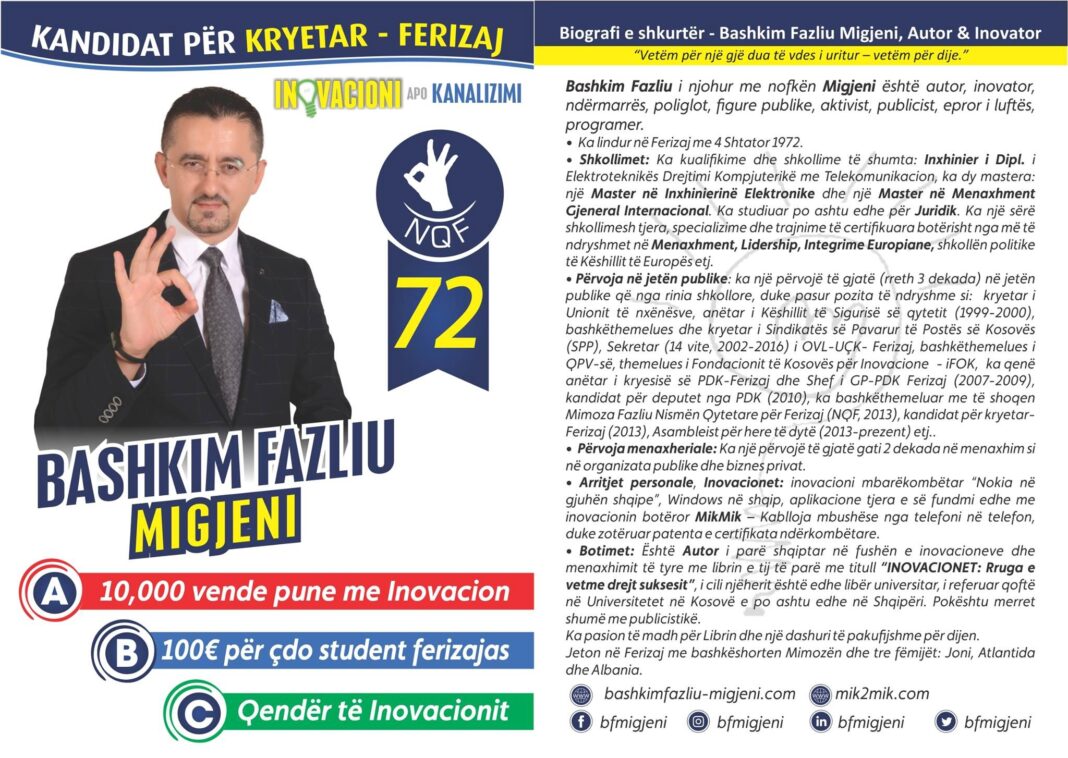 Ai nuk është thjesht kandidat i pavarur për Kuvendin e Ferizajt me numrin ✔️163, por një ideator i një vizioni të ri për qytetin dhe për Kosovën – një Ferizaj të sigurt, të qytetëruar dhe të denjë për Europën.