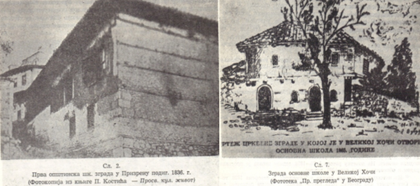 Foto 1. Objekti i shkollës së parë fillore serbe e hapur në vitin 1836 dhe Foto 2. Objekti i shkollës serbe të hapur në fshatin Hoçë të Madhe , në vitin 1872