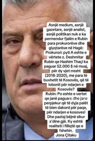 Në dritën e dëshmive të bëra publike nga seancat e Gjykatës Speciale në Hagë, ku u konfirmua nën betim se janë paguar 52 mijë dollarë në muaj, për dy vite rresht (2018–2020), të marra drejtpërdrejt nga buxheti i Republikës së Kosovës, me qëllim të lobimit për ndarjen e Kosovës, ndihem i detyruar t’i drejtohem opinionit publik me këtë deklaratë.