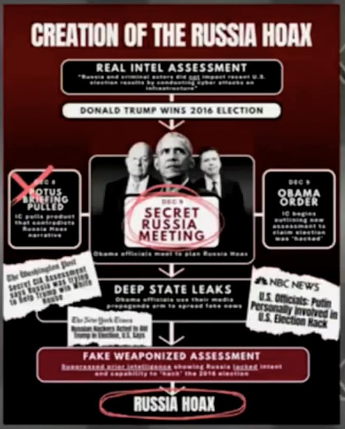 - Më 6 janar 2017, u publikua një Vlerësim i ri i Komunitetit të Inteligjencës, që kundërshtonte drejtpërdrejt vlerësimet e IC që u bënë gjatë gjashtë muajve të mëparshëm. Pas muajsh hetimesh mbi këtë çështje, faktet zbulojnë se ky vlerësim i ri u bazua në informacione që ata që ishin të përfshirë e dinin se ishin të sajuara, d.m.th. Dosja Steele ose që konsideroheshin të pabesueshme. Këto ishin informacione të politizuara që u përdorën si bazë për shpifje të panumërta që kërkonin të delegjitimonin fitoren e Presidentit Trump, hetimin shumëvjeçar të Mueller, dy shkarkime nga Kongresi, zyrtarë të nivelit të lartë që hetoheshin, arrestoheshin dhe burgoseshin, rriteshin tensionet SHBA-Rusi dhe më shumë.