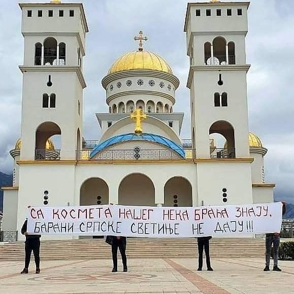 Janar 2021 , tek Kisha e Shën Jovan Vladimitit mbi Malin e Rumisë, në komunën e Tivarit, që u ndërtue pa i pyetur shqiptarët. Gjuha e urrejtjes ndaj shqiptarëve mund të vërehet edhe në këtë pankartë që e bartin këta fëmijë, që fatkeqësisht keqedukohen me urrejtje e shovinizën ndaj të tjerëve qysh në moshën më të re.