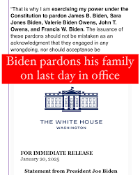Vetëm një ditë apo disa orë para se të largohej nga detyra më 20 janar 2025, Presidenti i atëhershëm Joe Biden nënshkroi një grant ekzekutiv për mëshirë (falje), për vëllain e tij James dhe gruan e vëllait të tij, Sarah Jones Biden; motra e tij, Valerie Biden Owens, dhe bashkëshorti i saj, John T. Owens; dhe vëllai i tij Francis W. Biden.