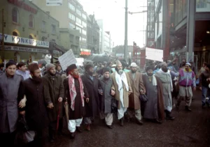 Djegia e librave dhe demonstratat (1989): Pamjet nga viti 1989 tregojnë turma të zemëruara, sidomos në Pakistan dhe Britani (si në Bradford), që djegin libra dhe figura (kukulla) të Salman Rushdie.