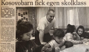 Unë ( Sinan Kastrati) në orën e mësimit me nxënës shqiptar nga Kosova, të ikur në kohë lufte, më 1999. Mönsterås, 2000