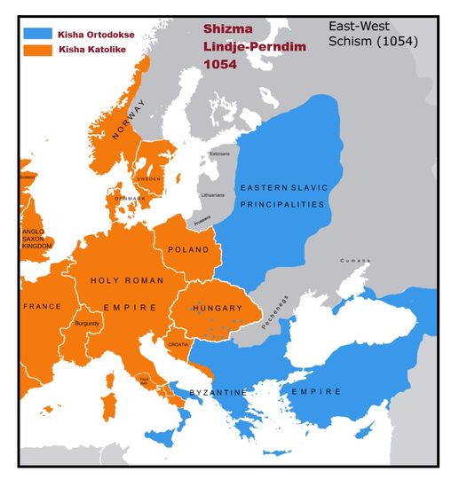 Ndarja e besimit u përforcua nga përcaktimi i Bizantit si kryeqyteti i dytë i Perandorisë Romake. Si rezultat, perandoria ra politikisht në dy gjysma. Primati i Papës në Romë u refuzua gjithnjë e më shumë. Kjo përfundimisht arriti kulmin me shkishërimin e ndërsjellë të Papës dhe Patriarkut të Kostandinopojës në vitin 1054, i cili përfundimisht ndau kishën.