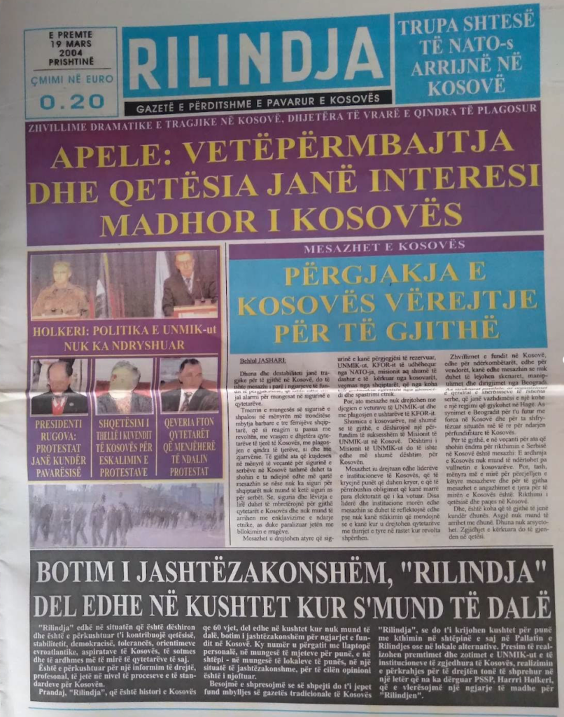 -Gazeta tradicionale Rilindja, që është histori e Kosovës, doli edhe në kushtet kur nuk mund të dilte, botim i jashtëzakonshëm për ngjarjet – trazirat e marsit 2004 në Kosovë… Në ballinë editoriali që kam shkruar me mbititullin MESAZHET E KOSOVËS e me titullin PËRGJAKJA E KOSOVËS VËREJTJE PËR TË GJITHË/
