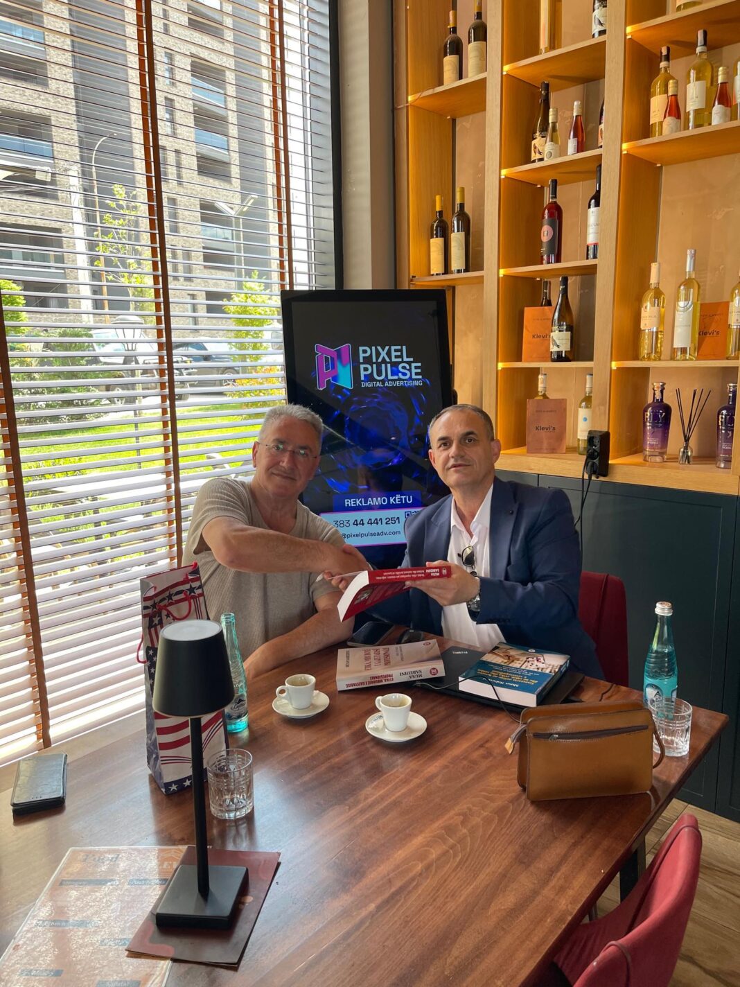 Autori i disa librave për gazetarinë Musa Sbedini me udhëheqësin e portalit Drini, Gjergj – Bajram Kabashin.