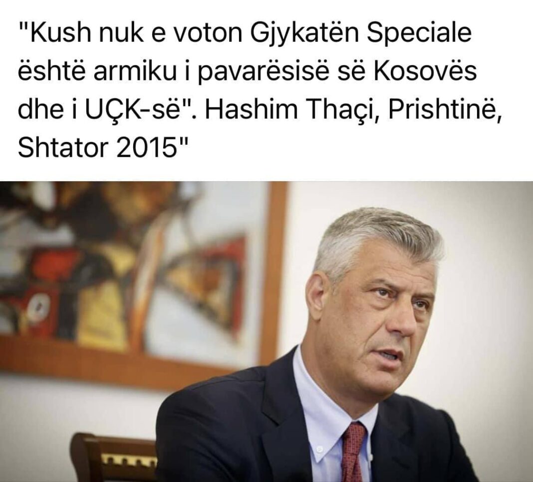 1. Ne filmin kult “The Godfather”, pjesa e pare, gjiruar 1972., skena antologjike dhe nder me sinjifikante eshte kur babi Vito Corleone i a perserit disa here djalit te vet Michael Curleone fjalin qe shkon keshtu disi: “Mbaje ne mend kete: Ai qe ta propozon ose te percjelle porosine e Barzinit per takimin me te, Barzinin, E PIKRISHT AI PERSON ESHTE TRADHTAR qe do te t’ percjelle ate porosi-propozim, dhe ne ate takim do te te vrasin.” ANALOGJIA me kete “interviste” te Hashim Thacit, dhe disa fakte tjera, shume lehte mund te shpalosin kush eshte tradhtar ne rrethin me te ngusht te Albin Kurtit. Se pari: Kush e propozoi dhe e pruni avokatin kroat Luka Mišetić te e mbron Hashim Thacin?! Vetem Hashim Thacin!!! Kush eshte avokati Luka Mišetić? Avokati kroat Luka Mišetić e ka mbrojt ne Haag gjeneralin e famshem kroat Ante GotovinA, e te akuzuar per krime lufte ndaj popullates serbe ne aksionin me te njohur kroat me emertim “Oluja”, te sprovuar ne gusht 1995., kur Ushtria kroate mer nga USA driten e gjelbert te e liron teritorin e saj, ate pjese te teritorit kroat, pra te Kroacise, e te okupuar ne gusht 1990., nga rebelistet dhe qetniket serb. Ushtria kroate i shkel qetniket, i shkel tekstualisht qetniket serb, por behen dhe krime lufte ndaj popullsise civile serbe e ne ashtuquajturen pjesen e Kroacise, “Krajina”. Pra avokati Luka Mišetić e mbron ne Haag gjeneralin te famshem kroat Ante Gotovina i cili e prin aksionin e Ushtrise kroate “Oluja” (Stuhia”). E i njejti avokat Luka Mišetić po e mbron tash ne Haag vetem e vetem Hashim Thacin. Sa per keta tjere Krasniqi, Veseli, Selimi po i mbrojne kryesisht avokatet anglezet e per te cilit avakatet anglez gjykimi sa ma i gjat i shkon ne favor atyre avokateve sepse marin ma shume para. Pra KETU qendron thelbi i thelbit dhe e shpalos prapavijen: KUSH E PROPOZOI DHE E PRUNI AVOKATIN KROAT LUKA MIŠETIĆ TE E MBRON HASHIM THACIN NE HAAG?!! E ai qe e boni kete eshte tradhtari qe po i a qet thiken ne shpind dhe Albin Kurtit dhe Vjoses Osmani. Pike ketu.
