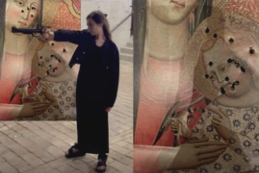 Atë ditë, Ameti kreu stërvitje në të shtëna me një pistoletë ajrore dhe postoi fotografi të saj në Instagram. Imazhi paraqiste Virgjëreshën Mari me Krishtin Fëmijë, të mbushur me vrima plumbash, duke përfshirë edhe vrima rreth kokave të të dy figurave. Fotografia erdhi nga një katalog arti i botuar nga shtëpia e ankandeve Koller.