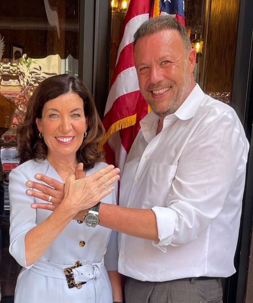 Z. Mark Gjonaj duke bërë simbolin e shenjtë të shqiptarëve, shqiponjës dy-krenare me Guvernatoren e shtetit të Nju Jorku, Kathy Hochul