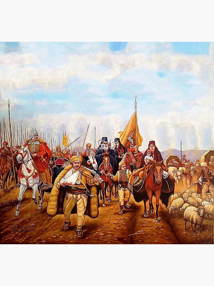 “Seoba srba…” (“shpërngulja e serbëve” nga Kosova…Një shpifje e madhe historike serbe, si të gjitha interpretimet historike të tyre. Në këtë pikturë shihet se të shpërngulurit nuk ishin “serbë”, por shqiptarë. Këtë tezë e vërtetojnë të gjitha faktet historike. “Migrimet e mëdha të serbëve”, ishin në fakt migrimet e mëdha të popullatës shqiptare nga territore të ndryshme nën Perandorinë Osmane drejt Mbretërisë së Hungarisë nën sundimin e monarkisë Habsburge. Këto shpërngulje të dhunshme kanë ndodhur në vitin 1690 dhe në vitet 1737–1739.