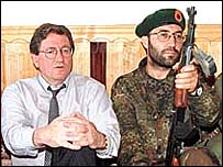 Hollbrook e Hajdin Abazi, 24 qershor 1998, Junik. Kjo foto është e prerë me gershërë, mungojnë të tjerët, edhe prof Fehmi Agani
