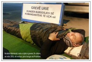 Kjo mumje në foto, e shtrirë në trotuar para hyrjes së burgut të Prishtinës në vitin 2013, në grevë urie kundër burgosjes së komandantëve Sylejman Selimi me shokë, ju bën LUTJE: mos u shpërdoroni nga thirrja për protestë më 17 shkurt në Prishtinë, sepse është e thirrur dhe e organizuar nga profiterët thaçistë, të cilët e kanë kapur Shoqatën e veteranëve dhe PDK-në, por që ia dolën t’i manipulojnë edhe parlamentet e Shqipërisë dhe të Kosovës – që t’i kundërvihen “Gjykatës Speciale” me presion politik!