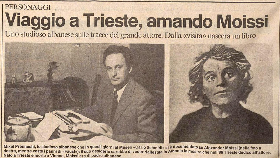 Mikel Prennushi, studiuesi shqiptar, i cili ditët e fundit në muzeun “Carlo Schmidl” ka hulumtuar për Aleksandër Moisiun (në foton në të djathtë, ndërsa ai luan rolin e “Faustit”): dëshira e tij do të ishte që ekspozita që Trieste i kushtoi aktorit në ‘86 të vihet në skenë edhe në Shqipëri. Lindur në Trieste dhe vdekur në Vjenë, Moisiu ishte shqiptar nga ana e babait.