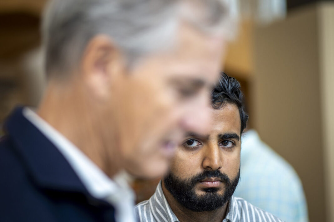 Oslo 20200721. Zëvendës lideri i Komitetit të Rinisë Al-Noor, Shan Mohammed, gjatë një bisedë në qendrën 22 korriku në Oslo mbi sulmet terroriste më 22 korrik 2011, sulmin ndaj myslimanëve norvegjezë në Qendrën Islamike Al-Noor në Bærum më 10 gusht 2019 dhe jetën pas kësaj. Lideri i Ap-së, Jonas Gahr Støre në plan të parë. Foto: Heiko Junge / NTB