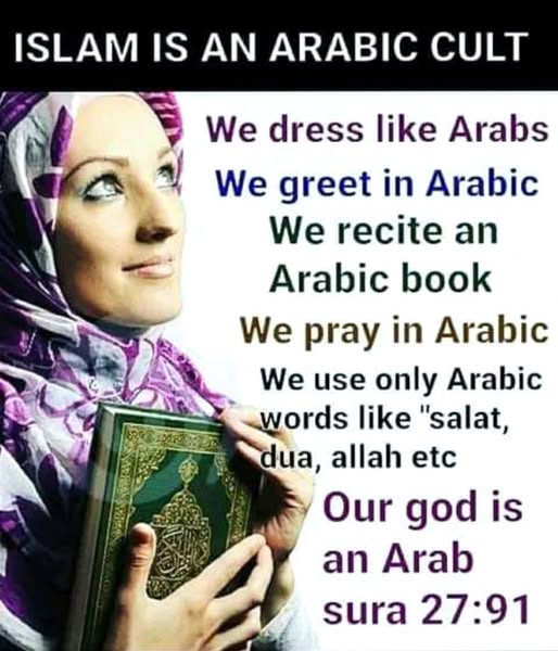 Islamizmi çdo gjë e ka arabe: gjuhën në të cilën është shpallur, vendin ku është shpallur, profetin kryesor, historitë e zhvillimeve të hershme fetare, kulturën që përmban brenda, mënyrëne shkrimit (prozë me rimë), tregime ngjarje, zakone arabe, bagëti arabe siç janë p.sh. devetë, pemë arabe siç janë hurmat, ligje arabe psh prerja e dorës hajdutit, mënyrat e divorcimit, kulti i Allahut që ishte hyjni supreme në panteonin arab pagan, muajt e vitit, kalendari, ditët e javës etj.