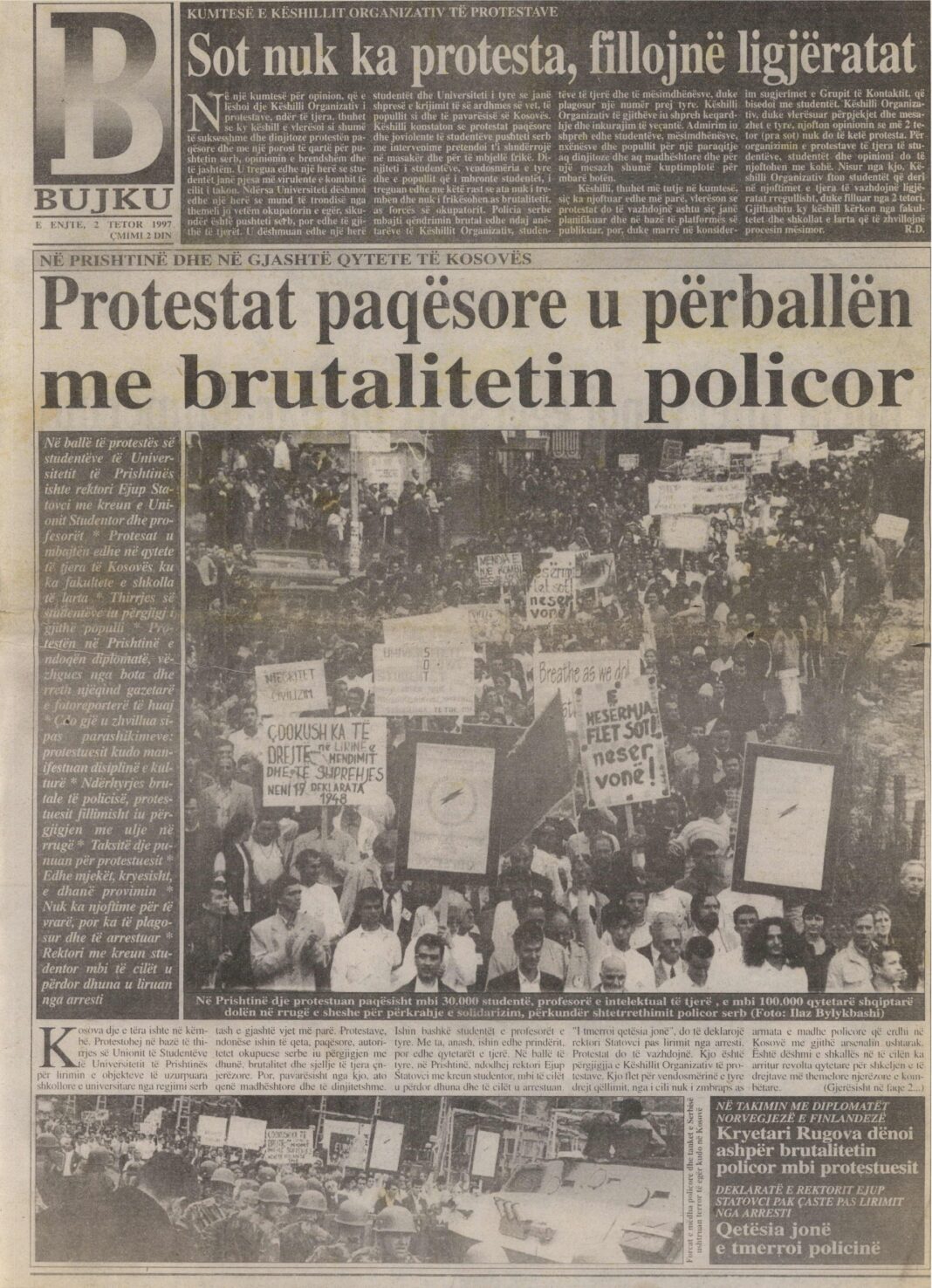 Para 27 viteve gazeta e vetme e përditshme shqipe në Kosovë i bënte jehonë e përkrahje të madhe protestës. “Në Prishtinë dhe në 6 qytete të Kosovës Protestat paqësore u përballën me brutalitetin policor”, shkruante në mbititull e kryetitull në ballinë gazeta e rezistncës “Bujku”, e cila në një nga nëntitujt theksonte se, “Nuk ka njoftime për të vrarë, por ka të plagosur e të arrestuar”.