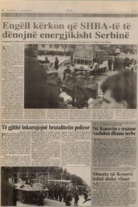 “Pas ndërhyrjes së policisë serbe kundër studentëve shqiptarë në Kosovë Kongresisti Amerikan Eliot Engëll kërkon që SHBA-të të dënojnë energjikisht Serbinë – Komuniteti ndërkombëtar nuk do të qëndrojë duarkryq për të lejuar që protestat paqësore të shtypen me dhunë”, theksonte gazeta në mbititullin, titullin e nëntitullin e një prej shkrimeve në shumë faqe.