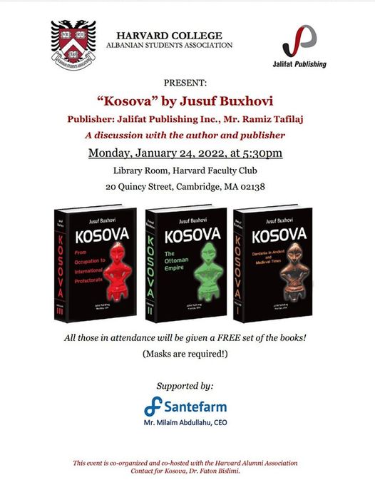 Ndjehem krenar që si ish-student i Harvardit dhe si Përfaqësues për Kosovë i Harvard Alumni Association, në bashkëpunim me Shoqatën e Studentëve Shqiptarë në Harvard College nën udhëheqjen e Gred Braho, e në bashkëpunim të ngushtë me botuesin e mikun tim të çmuar Ramiz Tafilaj (Jalifat Publishing, Houston) me mbështetjen e parezervë të z. Milaim Abdullahu (Santefarm, Prishtinë), do promovojmë librin e famshëm të historianit e publicistit të shquar të Kosovës, Jusuf Buxhovi, “Kosova” në tri vëllime, në Universitetin e Harvardit më 24 Janar 2022.