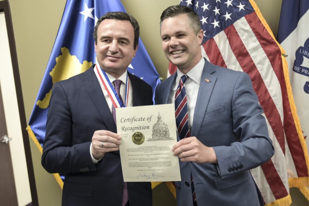 Me kërkesë të senatorit nga Qarku Polk, Zach Nunn, Senati njeh dhe dekoron Kryeministrin Albin Kurti, me medaljen e Shërbimit të Jashtëm të Shquar të Iowas. Kjo dekoratë, e projektuar nga senatori Zach Nunn, është një kryq maltez për qëndrueshmërinë e karakterit, e zbukuruar me stemën e shtetit të Iowas dhe e shënjuar me pikën referuese të Iowas, Kapitolin, që simbolizon përkushtimin ndaj shërbimit.