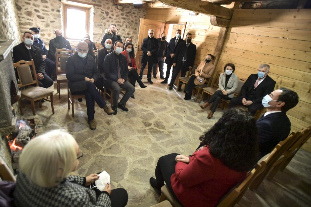 Albin Kurti e Vjosa Osmani duke biseduar me Zonjën Suzana Gërvalla, bashkëshorten e heroit Jusuf Gërvalla.