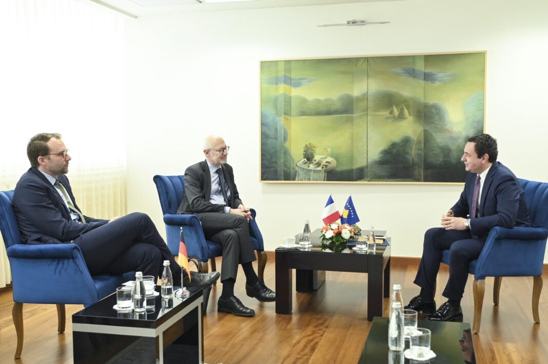 Prishtinë, 5 qershor 2023Kryeministri i Republikës së Kosovës, Albin Kurti, priti në takim sot në mëngjes Ambasadorin e Francës në Kosovë, Olivier Guerot dhe zëvendësambasadorin gjerman në Kosovë, Matthias Conrad.Në këtë takim u diskutua për zhvillimet e fundit në tre komunat në veri të vendit pas ditës së parë të punës së kryetarëve të rinj dhe dhuna e shkaktuar ndaj ushtarëve të KFOR-it, policëve të Kosovës dhe gazetarëve nga grupe ekstremiste serbe.U pajtuan për rëndësinë jetike të de-eskalimit të situatës. Kryeministri i njoftoi për profesionalizmin e lartë dhe integritetin e padiskutueshëm të Policisë së Kosovës në menaxhimin e situatës pa asnjë gabim apo defekt.