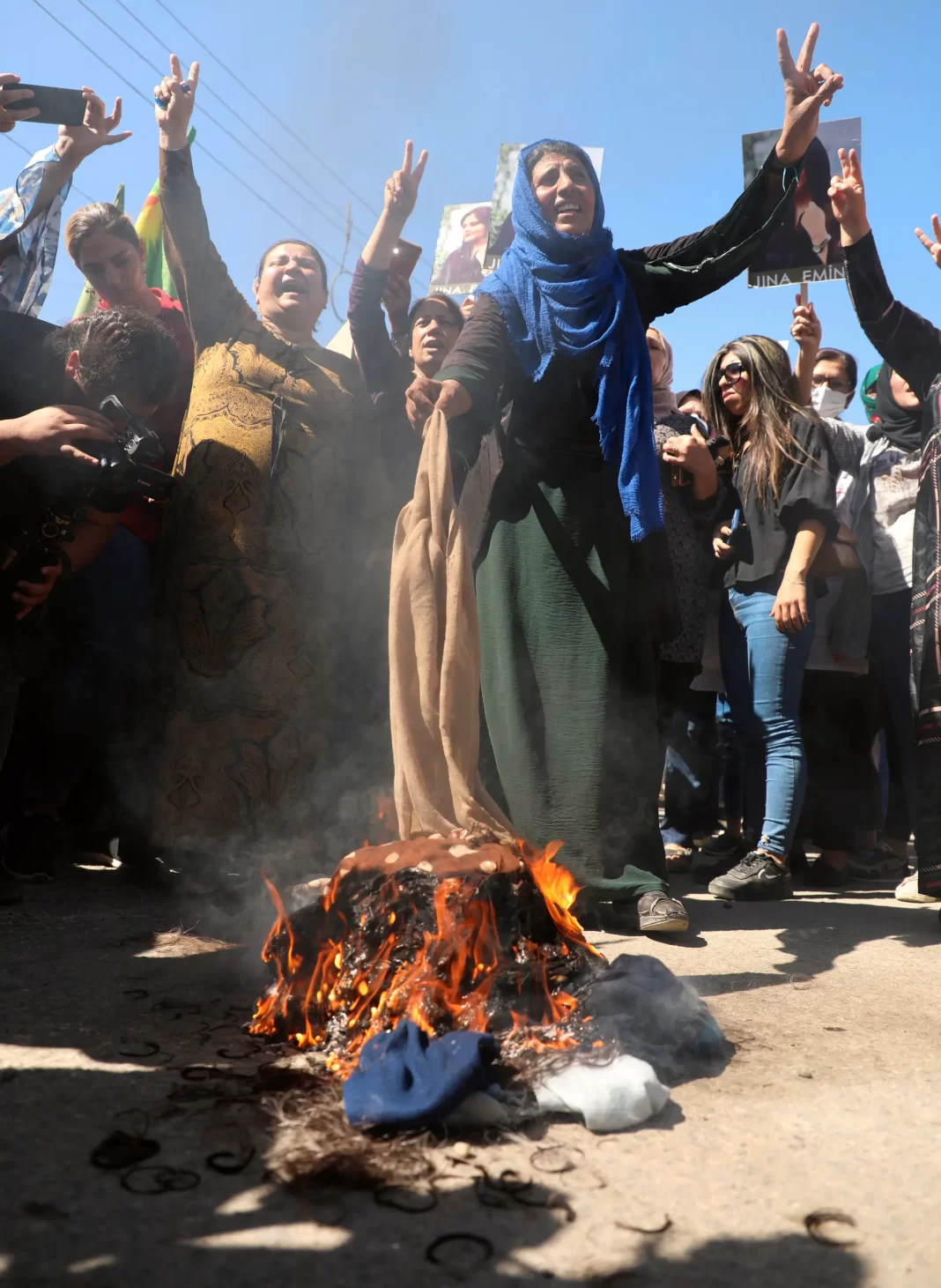 Djegia masive e shamive dhe çdo mbulese tjetër të kokës nga ana e grave iraniane. Demonstrata të fuqishme kanë tronditur Iranin ditët e fundit, pasi një grua e re u vra në paraburgim të të ashtuquajturës “polici morale”. Foto: Wana News Agency, Reuters/NTB
