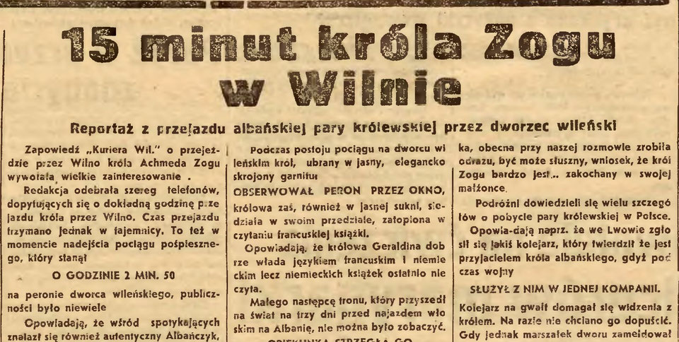 “Kurjer Wilenski” ka botuar, të premten e 14 korrikut 1939, në faqen n°2, rrëfimin e 15 minutave të Mbretit Zog dhe familjes mbretërore shqiptare në stacionin e trenit në Vilnius (Lituani), të cilin, Aurenc Bebja, nëpërmjet Blogut “Dars (Klos), Mat – Albania”, e ka sjellë për publikun shqiptar :