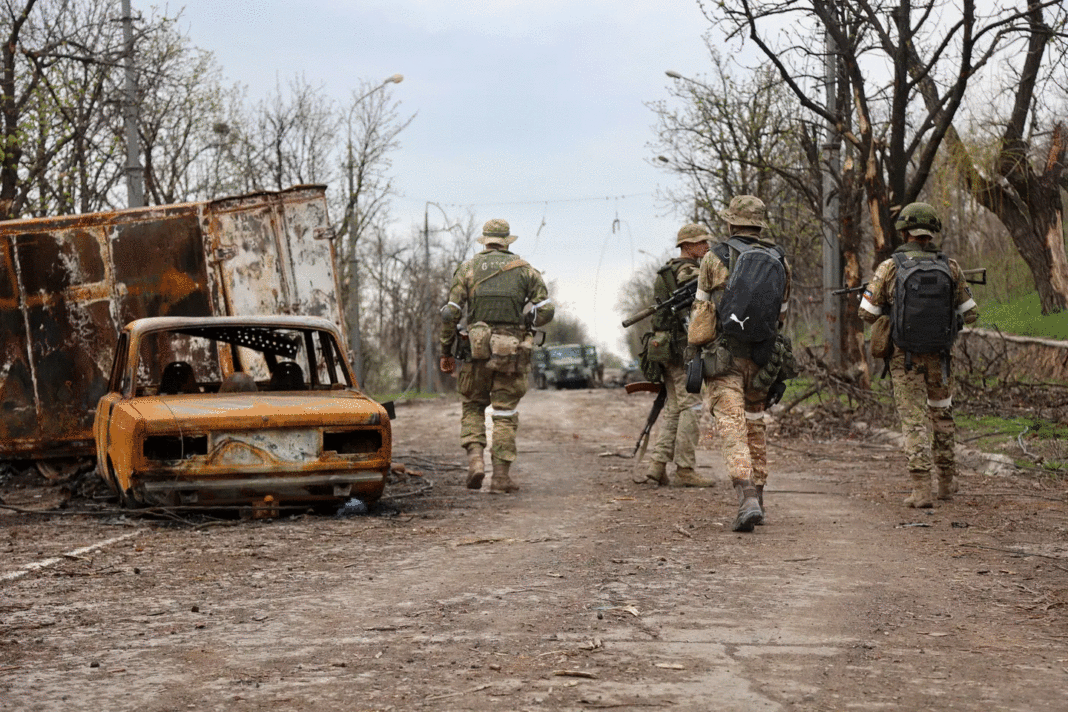 Separatistët e mbështetur nga Rusia po kalojnë afër automjeteve të shkatërruara pas luftimeve intensive në Mariupol. Fotoja është bërë më 19 prill. Foto: Alexei Alexandrov, AP / NTB