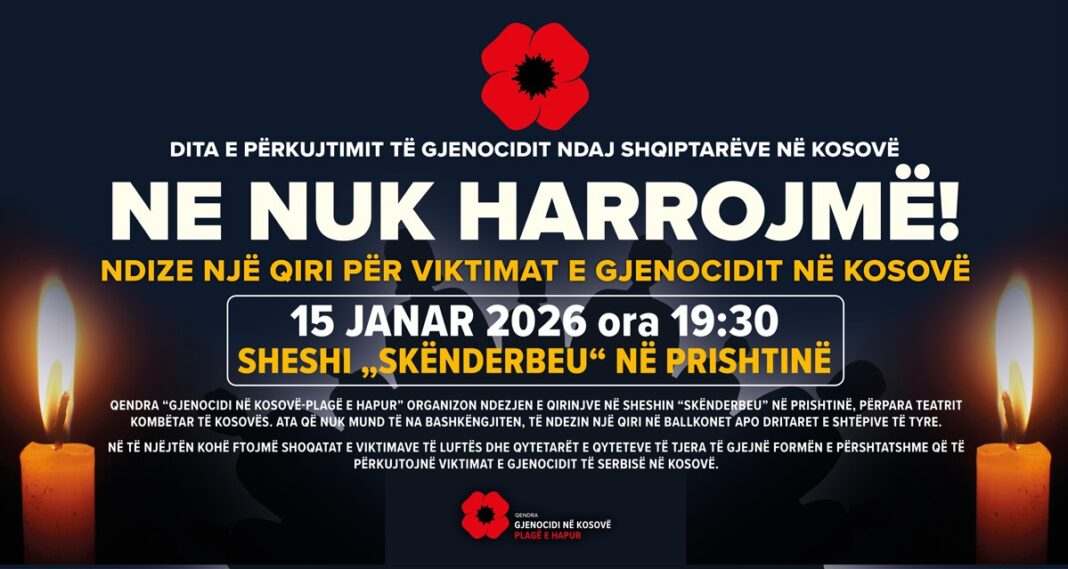 Qendra “Gjenocidi në Kosovë-Plagë e hapur” organizon manifestimin qendror në Sheshin “Skënderbeu” në Prishtinë, ku më 15 janar 2026, në ora 19:30, do të ndizen qirinjë në shenjë përkujtimi për viktimat e gjenocidit në Kosovë. Ata që nuk mund të na bashkëngjiten, të ndezin një qiri në ballkonet apo dritaret e shtëpive të tyre.