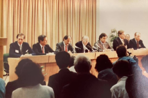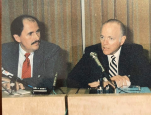 Kryetari i delegacionit të Kongresit Amerikan, Senatori Dennis DeConcini i shtetit Arizona në konferencë me shtypin në Tiranë