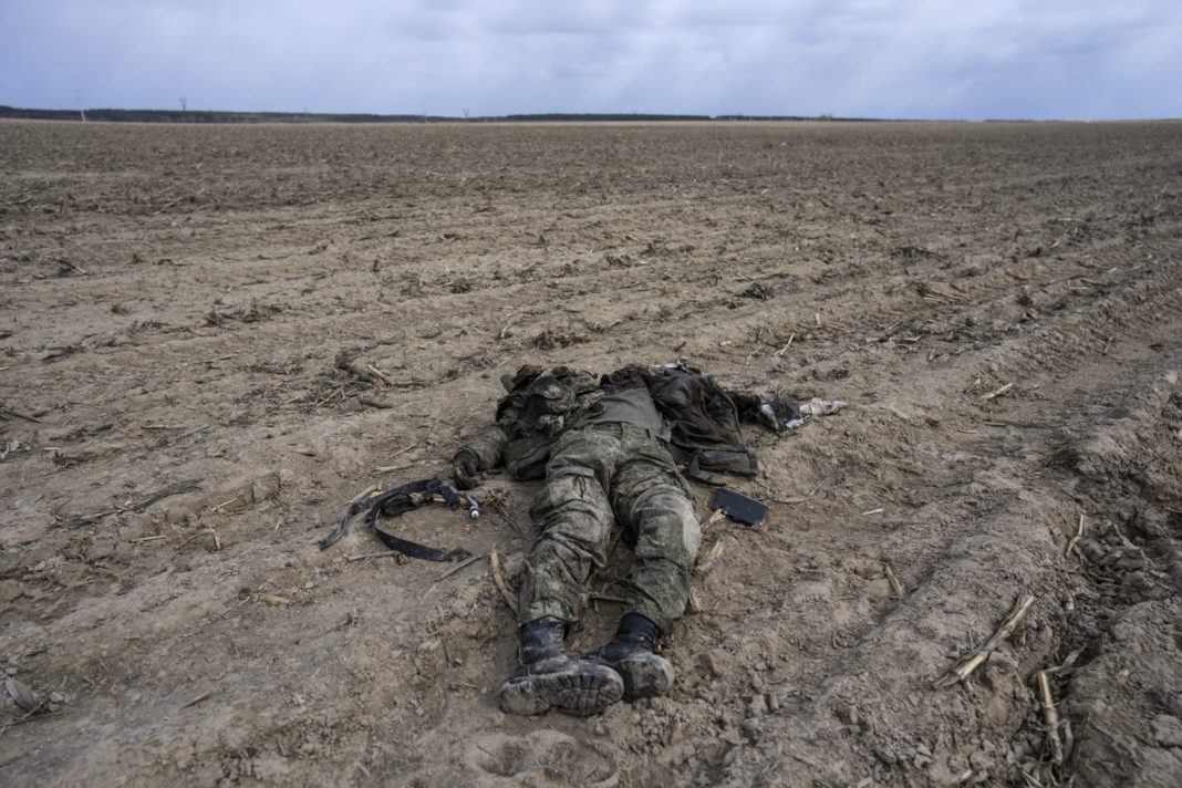 Ushtar i vdekur rus në një fushë misri në Sytnyaky , në periferi të Kievit, e diel, 27 mars 2022. Foto: Rodrigo Abd/AP/NTB
