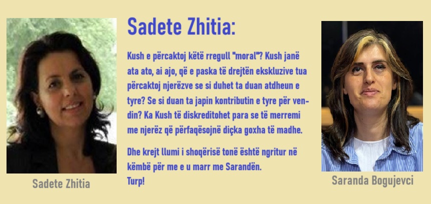 Mund të jetë një imazh i 2 persona dhe teksti që thotë "Sadete Zhitia: Kush e përcaktoj rregull "moral"? Kush janë ata ato, ai ajo, Ae paska tẽ drejtën ekskluzive tua përcaktoj njerëzve se si duhet ta duan atdheun e tyre? Se si duan ta japin kontributin e tyre për ven- din? Ka Kush tẽ diskreditohet para se tẽ merremi me njerëz Ae përfaqësojnë diçka goxha madhe. Dhe krejt llumi shoqërisë tonë është ngritur në KeTpe për me marr me Saranden. Turp! Sadete SadeteZhitia Zhitia Saranda Bogujevci"