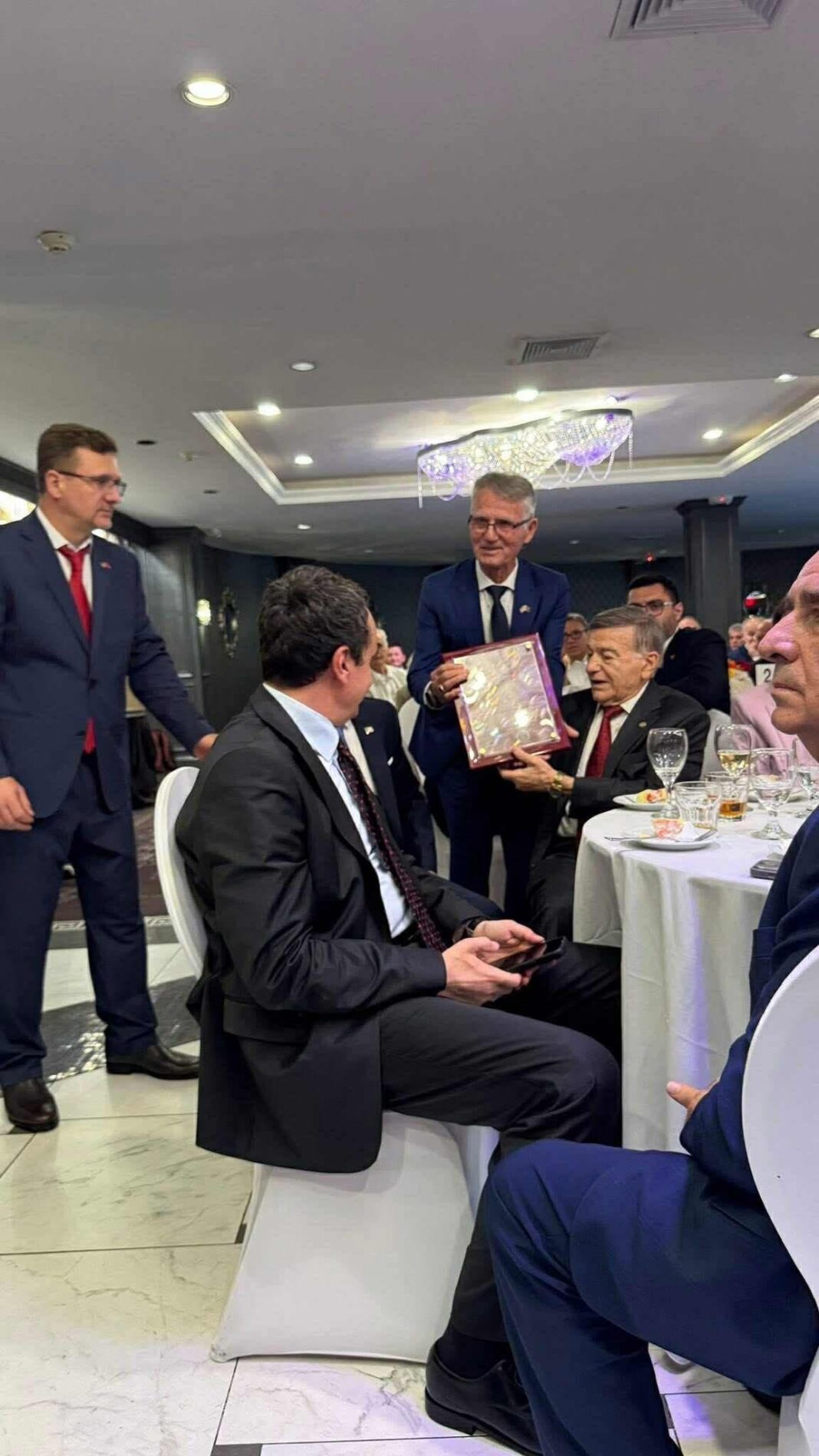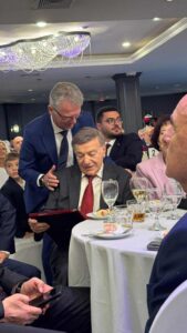 Fotografitë janë nga takimi i Joseph e Shirley Cloyes DioGuardit me Mërgatën Shqiptare në Botë, në Nju Jork, SHBA. Bahri Ramadani, kryetari i MSHNB, duke i dorëzuar Mirënjohjen Xhiozef Diogardit për veprimtzarinë e tij Kombëtare Shqiptare, në prani edhe të kryeministrit Albin Kurti.