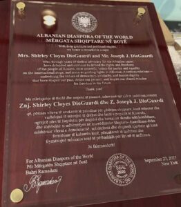 Ky dedikim nga “Mërgata Shqiptare në Botë” i cili nderoi çiftin Joseph dhe Shirley Cloyes DioGuardi me një pllakë mirënjohjeje të veçantëevent nuk ishte thjesht një nderim, por një reflektim mbi ndikimin e DioGuardëve dhe forcën e diasporës, që falënderon “përkushtimin e pashoq për promovimin e bashkimit kombëtar dhe drejtësinë”.