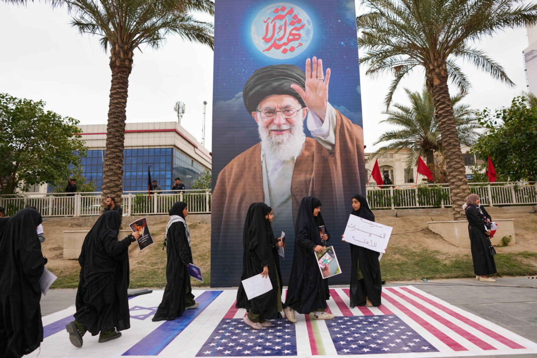 Iraqi step on a representation of an U.S. flag flags and Israeli flag during a protest against U.S. and Israeli attacks on multiple cities across Iran, in Baghdad, Iraq, Thursday, March 12, 2026. (AP Photo/Hadi Mizban)