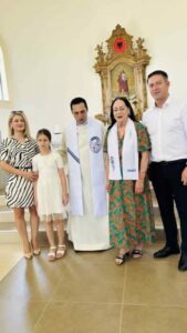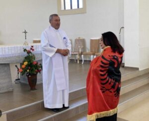 Luljeta Puna pranë altarit në Llapushnik me priftin Fran Kola