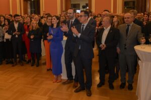Nën tingujt e kësaj mbrëmjeje festive dhe cakërrimit të gotave me nga një gotë verë të Kosovës, në skenë na shfaqet Shtojere Zogaj, diplomate për Kulturë në Ambasadën e Kosovës me një sharmë të shkëlqyer festiv i drejtohet të pranishmëve në të dyja gjuhët dhe u uron mirëseardhje mysafirëve dhe bashkatdhetarëve që kishin ardhur në festë nga të gjitha qytetet e Gjermanisë. Intonimi i Himnit të Kosovës dhe atij të Gjermanisë sikur e paralajmërojnë Ambasadorin e Republikës së Kosovës në Gjermani, Dr. Faruk Ajeti, ta marrë fjalën për t’i sjellë para tyre përshëndetjet e popullit të Kosovës dhe bashkatdhetarëve që jetojnë dhe punojnë në Gjermani.