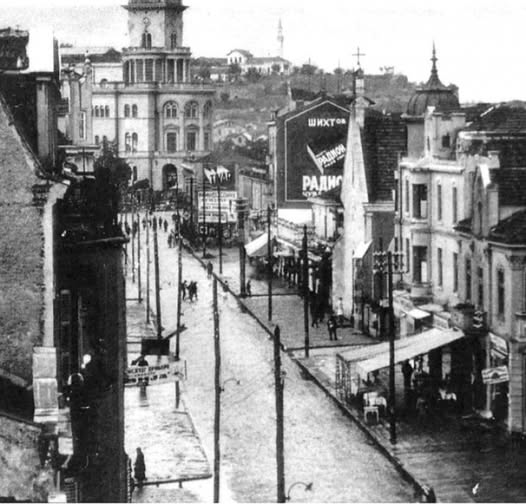 Në këtë fotografi të rrallë dhe të çmuar të Shkupit të vjetër, syri ndalet me mall tek Kisha Katolike e Zemrës së Shenjtë të Jezusit, e cila qëndron krenare në zemër të rrugës së qytetit. E ndërtuar në fund të shekullit XIX, kjo kishë ishte më shumë sesa një vend adhurimi — ishte një pikë takimi për komunitetin, një strehë shpirtërore dhe një simbol i bashkëjetesës ndërfetare në këtë qytet shumëngjyrësh.