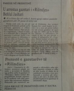 Me titullin “U arrestua gazetari i ‘Rilindjes’ Behlul Jashari”, gazeta ka shkruar  se veprimtari i njohur i Këshillit për Mbrojtjen e Lirive dhe të Drejtave të Njeriut “avokati Bajram Kelmendi kuptoi se klienti i tij u mor në polici lidhur me një proces gjyqësor që zgjat që nga viti 1989 e që ka të bëjë me shkrimet e ‘Rilindjes’ në shkurt të atij viti për grevën e njohur të minatorëve të ‘Trepçës’”.