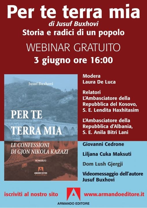Nesër në Romë, promovohet romani i Jusuf Buxhovit “Per te terra mia – Le Confessioni di Gjon Nikola Kazazi” (Shënimet e Gjon Nikollë Kazazit) i botua këto ditë në italisht nga shtëpia e njohur botuese e Romës “Armando” në përkthimin e Liljana Cuka-Maksuti.