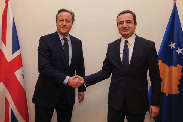 Në vizitën e tij të parë zyrtare jashtë vendit për këtë vit, Sekretari i Jashtëm britanik David Cameron vizitoi Prishtinën, që për “ne, ishte kënaqësi ta nisnim vitin 2024 me Lord Cameron dhe miqtë, aleatët e partnerët tanë britanikë”, -ka thënë me atë rast, Kryeministri i Republikës së Kosovës, Z. Albin Kurti. Kryeministri i Kosovës, falënderoi vizitorin e lartë dhe Britaninë e Madhe për kontributin dhe mbështetjen e vazhdueshme që kanë dhënë për Kosovën. E njoha me situatën në vend e përkushtimin tonë për zhvillim ekonomik, luftim të krimit dhe korrupsionit, ngritje të mirëqenies së qytetarëve dhe garantimit të sigurisë e paqes përballë sjelljes agresive dhe kërcënuese të Serbisë. Marrëdhëniet tona bilaterale qëndrojnë të forta e të palëkundura”,- ka theksuar Kryeministri Kurt.