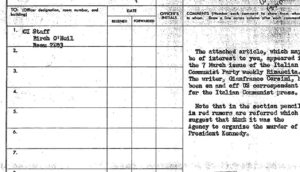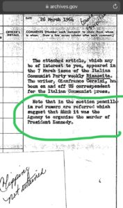 Një memo e sapodeklasifikuar, tregon raportet e gjurmimit të CIA-s nga botimi I artikullit ne gazeten italiane “Rinascita” organ i Partisë Komuniste Italiane, i cili akuzoi hapur CIA-n për orkestrimin e plotë të vrasjes së Presidentit të SHBA-së demokratin John F. Kennedy-t.