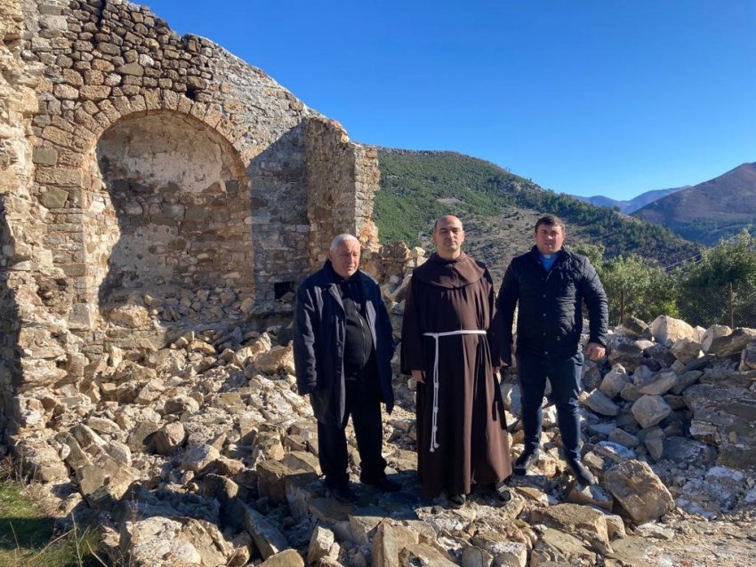 Në foto: Dom Nikë Ukgjini pranë Kishës 700-vjeçare të shembur në Lezhë, e shpallur “Monument Kulture”, që në vitin 1973 (Fotot nga Dom Nikë Ukgjini)
