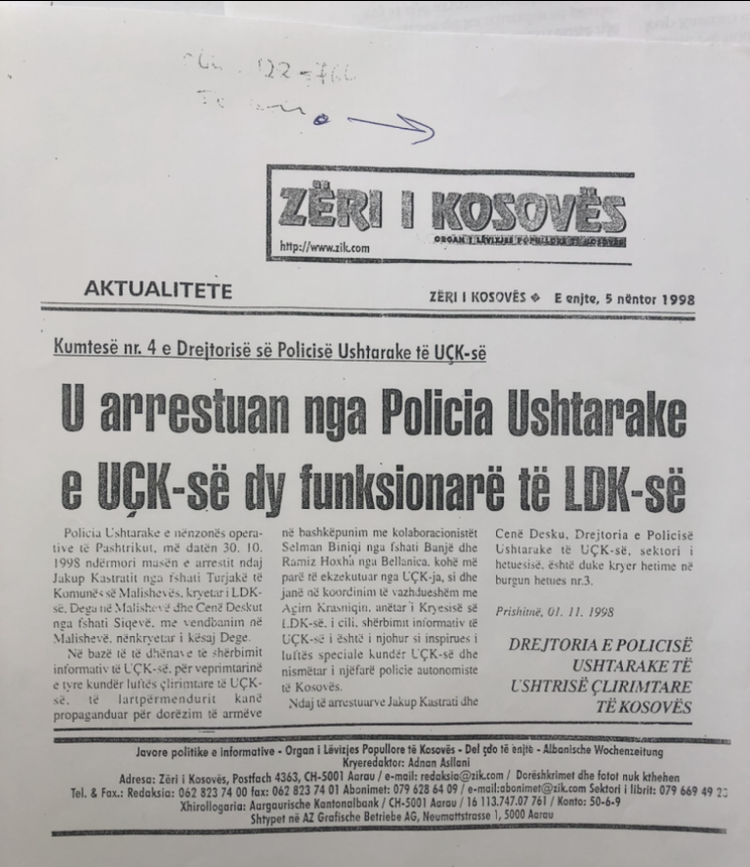 Dhet përmendur se më 2 Nëntor 1998 janë vrarë Ramiz Hoxha dhe Selman Binishi dhe më 30 Tetor 1998 janë burgosur edhe Jakup Kastrati e Cen Desku, kështu shkruante ”Zëri i Kosovës” ….