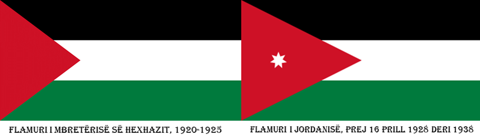 Mbretëria e Hexhazit, në vitet 1917 deri më 1920, e pati flamurin e njejtë me atë të Revoltës arabe, kurse nga viti 1920 e ndryshoi, duke ndërruar ngjyrën e gjelbër në vend të ngjyrës së bardhë-pra shpikën të njejtin flamur që sot e përdorin arabët e territorit izraelit të Palestinës. Kurse pastaj Jordania më 16 prill 1928 deri 1939, respektivisht si Transjordani deri më 17 qershor 1946, kur arriti pavarësinë e plotë. Mirëpo Transjordania më 1946, arriti pavarësinë e plotë.18Siç vërehet që flamuri i sotëm i Palestinës, është kopjuar prej këtij flamuri, vetëm se në vend të yllit 7 cepësh është vendosur gjysmëhëna me kryqin katolik në krah, 10 vite më pas më 1938.