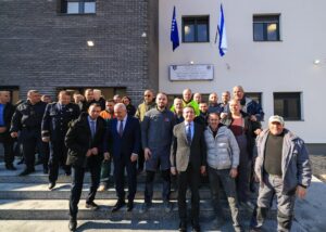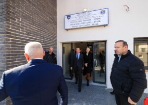 Ovde smo zajedno sa ministrom Unutrašnjih poslova Xhelalom Sveçlom, sa direktorom policije Gazmendom Hoxhom i sa potpukovnikom Vetonom Elshanijem u Leposaviću, u Lešaku, gde smo upravo inaugurisali objekat policijske podstanice, koja je ujedno i zgrada Agencije za civilnu registraciju.