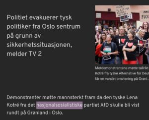 NTB e përshkruan partinë gjermane si “Nacional Socialiste” në kauzën e saj, duke etiketuar kështu 26 përqind të votuesve gjermanë si nazistë. AfD u vlerësua së fundmi si partia më e madhe në vend të martën e kësaj jave.